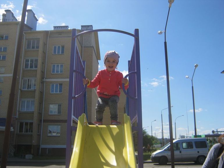 Пошли пешком до химчистки и сдали мое зимнее пальто (спешите молодечненцы, там скидки 15% до 30 июня), потом в Евроопт, потом к 9-ти этажке (секретное место, потому как в Молодечно не одна 9-ти этажка, это всего-навсего перекресток Строителей и Скорины) за клубникой и земляникой. Обратно шли через дворы и детские площадки, каковых там нет, а только жалкие остатки каких-то доисторических горок и турников(