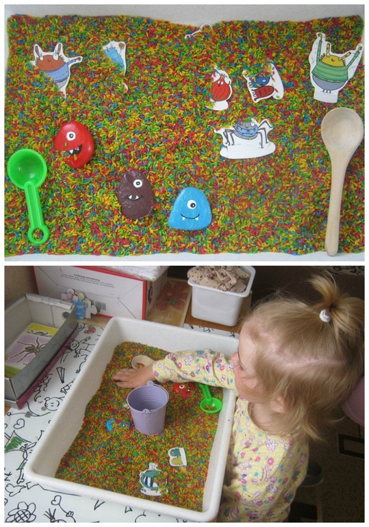 И еще была сенсорика - разноцветный рис и спрятанные картонные монстры и камешки-монстры.