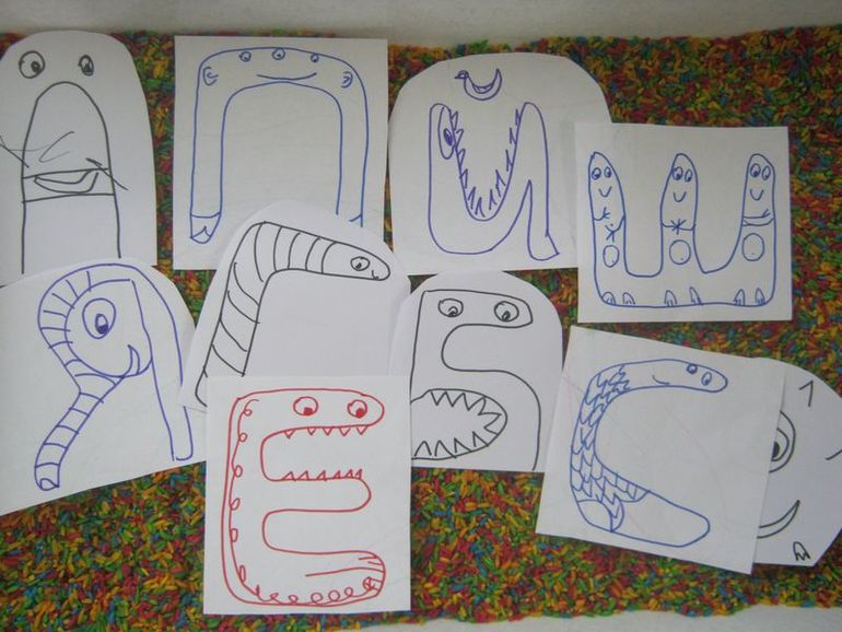 Творчество. Я планировала разрисовывать шаблоны монстров и разрезать их. Но все получилось иначе, как-то спонтанно пришла в голову идея рисовать буквы-монстры. Дочка называла букву, а я рисовала. Заодно и буквы вспоминали.