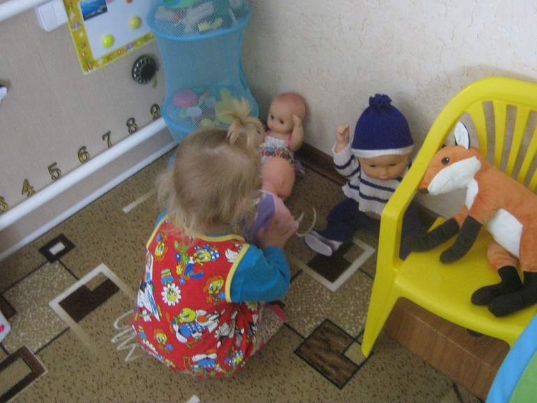 Вечером собрала всех кукол и играла в садик) Соберет в охапку, отнесет в уголок и вот они в садике. Потом пойдет заберет и отнесет в домик)