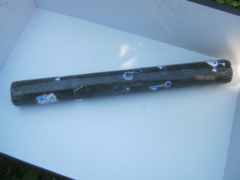 Подзорная труба. Это трубка от фольги, выкрашенная в черный. Еще я наклеила картиночки на пиратскую тему, а папа обклеил скотчем.