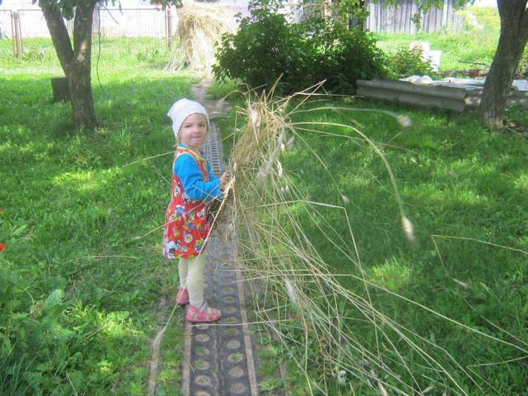 Помогает папе носить солому.