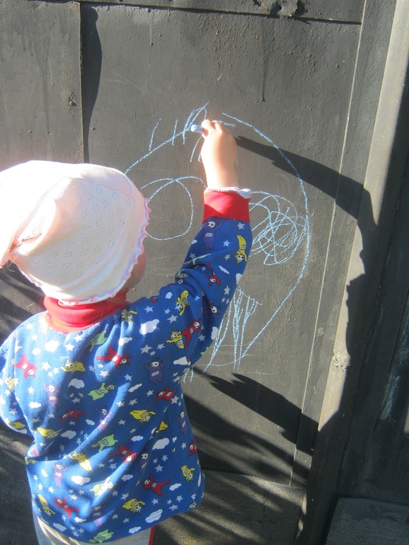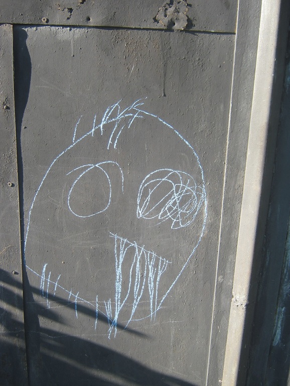 Ну и последний шедевр все сама. Нарисовала на гараже монстра! Глаза, волосы, рот и зубы (это именно зубы там такие длинные) и борода. Форменный злодей получился)