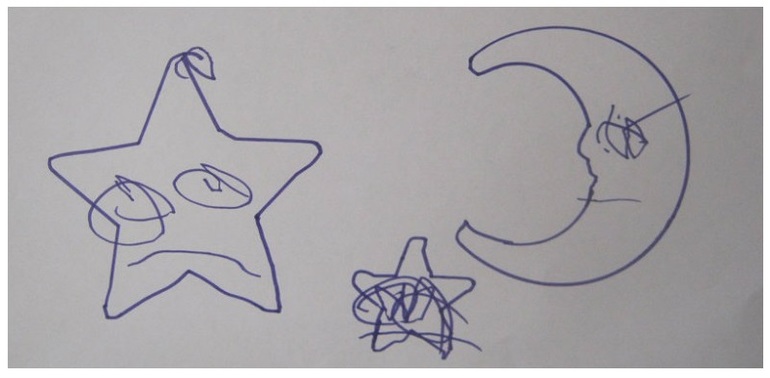 Вот первый ее человечек. Полине 2,8 г. Все на месте: нос, глаза, уши, волосы и рот. Даже щечку разрисовала. Красота)