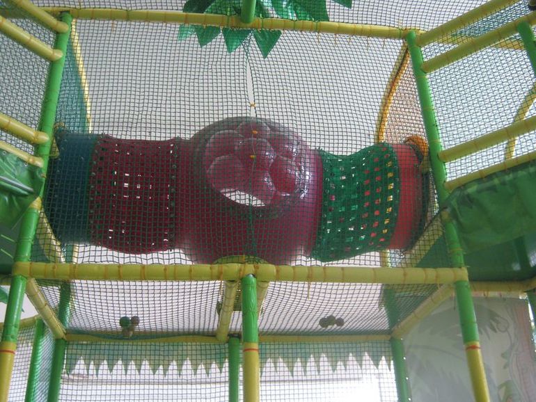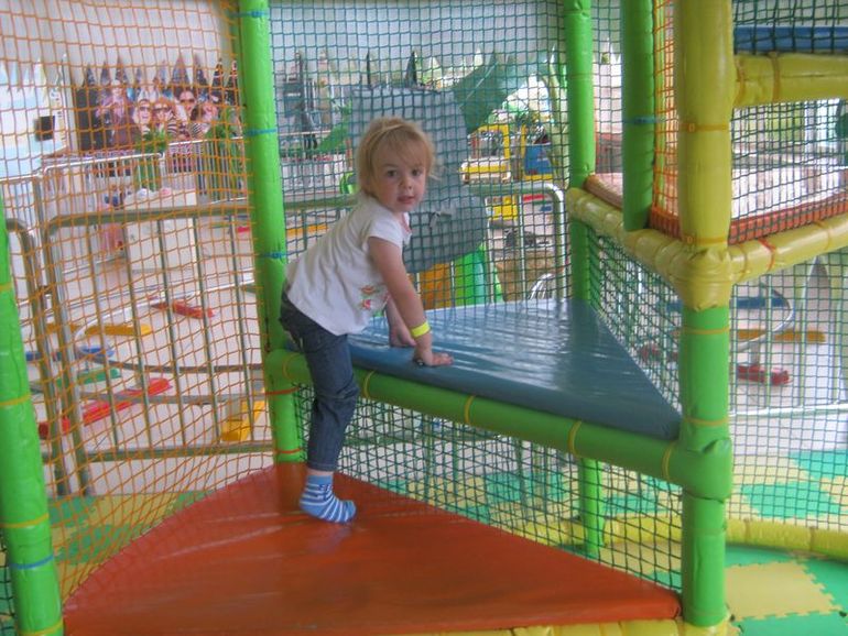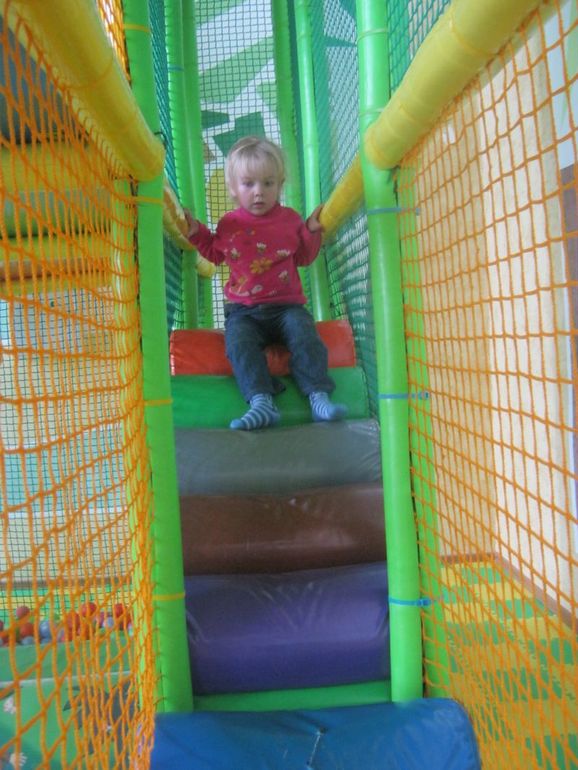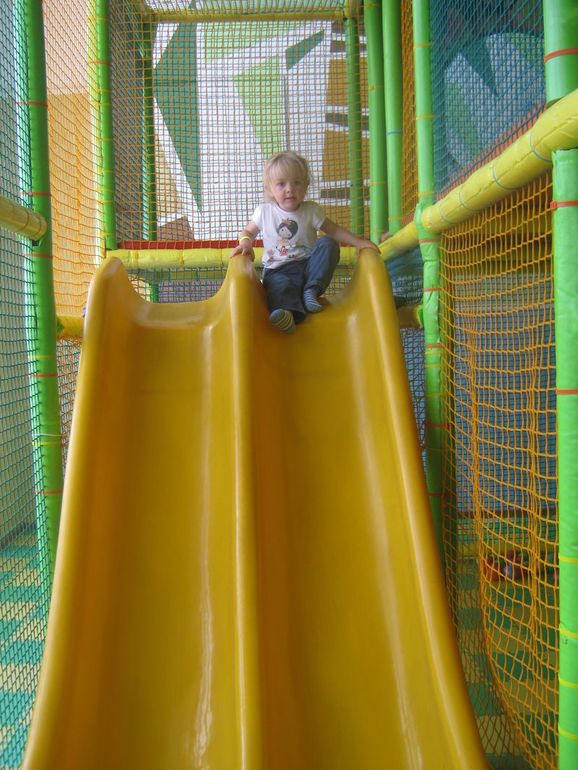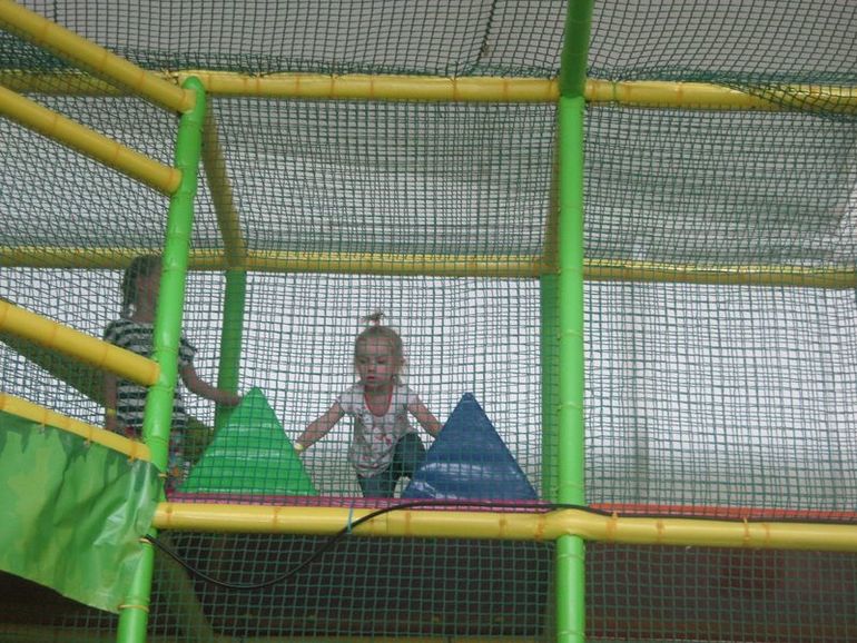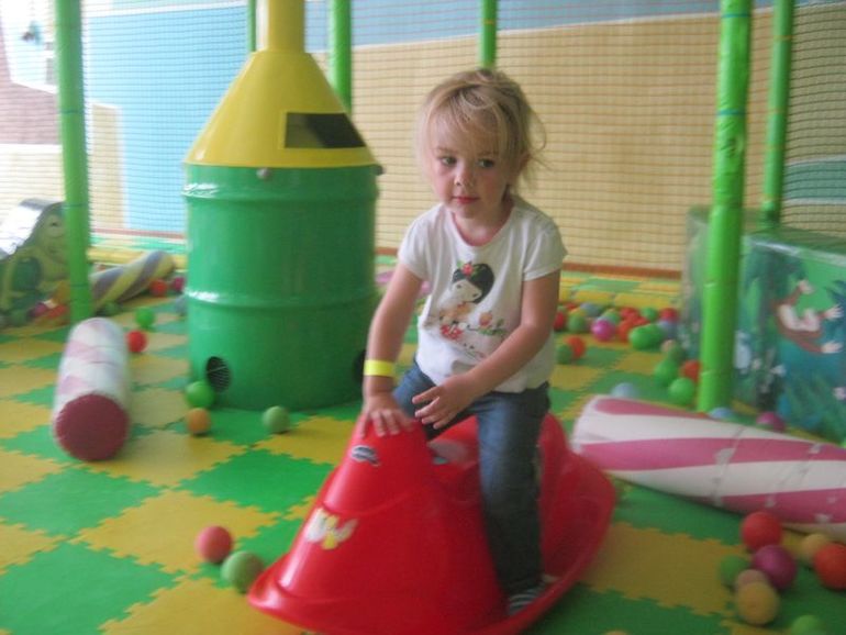 Я не ожидала, что Поле так уже понравится. Она пробыла 1 час 20, лазила по всем лестницам и этажам, каталась со всех горок. Особенно ей полюбилась труба. Как это она не убоялась туда залезть? Но веселья было масса, она каталась на ней раз 15 не меньше)