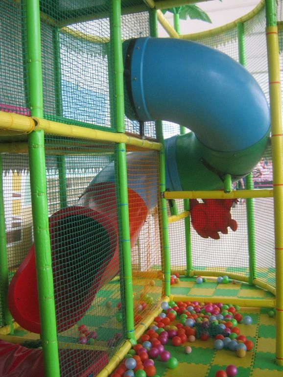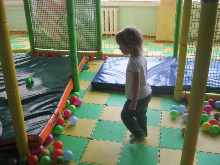 Детей вечером было больше и все каких-то большунов 5-7 лет, человек всего около 10, но никто никому не мешал. Потом они ушли и остались малыши Полинкиного возраста. Но у нее столько дел, что с детьми она особо не играет. Ведь нужно полазить по лесенкам, собрать мячики, пострелять из пушки, съехать с горки)
