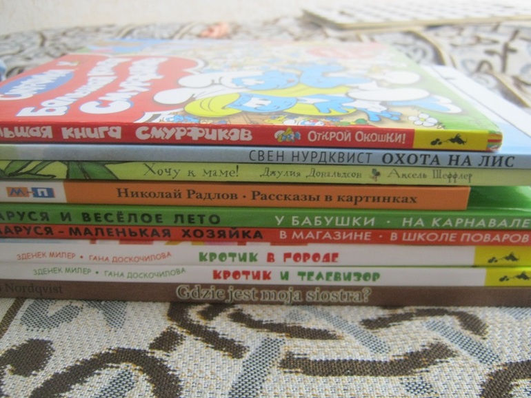 Итак, я решила тоже зафиксировать что же мы на этой недельке читали, хотя бы приблизительно. Почему приблизительно, потому что не помню, что читали в понедельник, и не знаю, что будем читать вечером в воскресенье. Поэтому все книжки я складывала на комод аккуратной стопочкой и к концу недели набралась внушительная стопка.