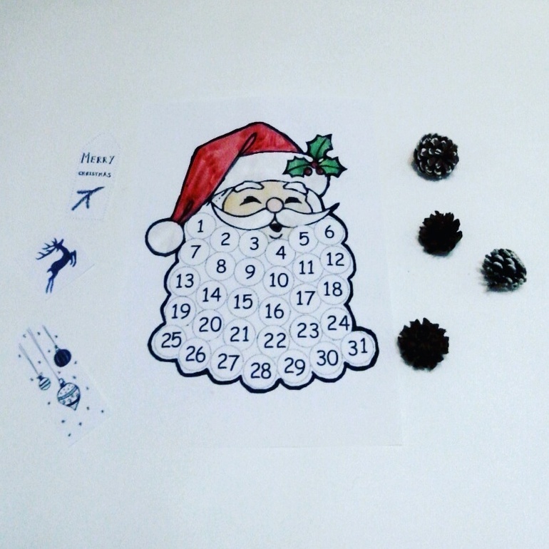 Распечатали, раскрасили, и, вот он, наш скромный адвент - календарь, будем приклеивать ему бороду из ваты ))) Ребенок доволен)))