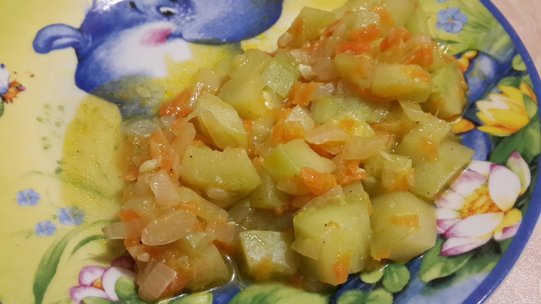 Ну, и наше блюдо из кабачков - кабачки тушеные с морковкой и луком - Вера в процессе перемешивала кабачки своей ложкой)))