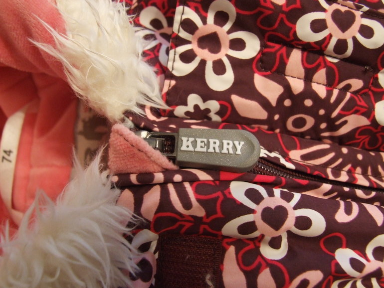 Комбинезон KERRY выполнен из дышащей, водо- и грязеотталкивающей ткани Kerry Active. Очень теплый (можно носить до -25 градусов мороза) и в то же время легкий. Имеет длинную молнию, от капюшона до низа левой штанины, что значительно упрощает одевание. Мягкая велюровая подкладка по всему комбинезону, кроме рукавов и штанин - в них специальная "скользящая" подкладка, чтобы проще было просунуть ручки и ножки малыша. Капюшон на резинке, не отстегивается, отделан искусственным мехом, на велюровой подкладке и с утеплителем. KERRY имеет отвороты на рукавах и штанинах, за счет этого, пока комбинезон великоват, в коляске можно обойтись без рукавиц и пинеток - просто загибаете специальный отворот и он наглухо закрывает рукав или штанину. Есть штрипки (резинки) на ботинок. Небольшие загрязнения легко удаляются влажной губкой, также комбинезоны можно стирать в стиральной машине.