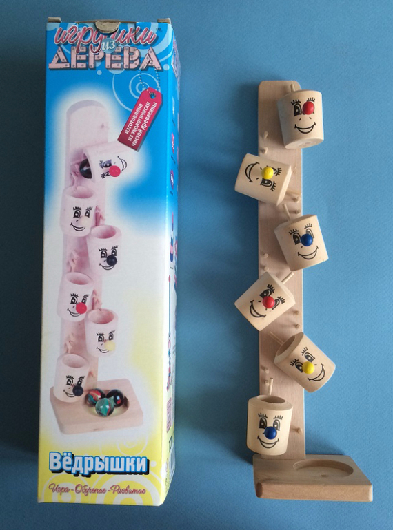 4. "Ведрышки" - надо положить шарик в верхнее ведрышко, оно перевернется, за ним другие,когда шарик попадет к ним и в самый низ. Такого восторга не вызвал даже домик подобного плана (идет в п. 5). Один минус - шарики мелкие и даже сейчас не рискую оставлять с игрушкой один на один, потому стоит высоко на полке.
