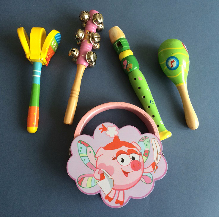 2. Музыкальные инструменты (Кастаньет, Бубенцы, дудка, маракас, бубен). Звук у всех оказался хороший, нарекание только к кастаньетам - сложно извлекать звук для малыша, туговато.