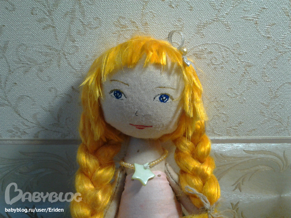 Волосы из шелка, сшита из хлопка стрейч (поэтому лицо такое фланелистое, ворсинки видны на фото). Вживую у куколок из этого материала ворсинки не видны.