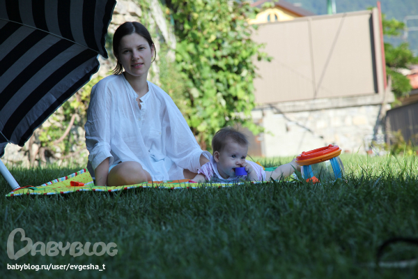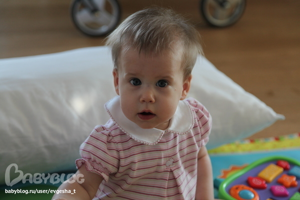Из умелок разительных сдвигов нет – ползать отказываемся даже по-пластунски (иногда отпрыгиваем назад, а в основном перекатываемся в бок и крутимся на животе), сама не садится, но если посадят может так минут 10-15 поиграть. Выработался командный голос и недовольный клич, на который сбегается вся округа!) Тянет руки только к маме, а если бабушка от мамы забирает, вцепляется в последнюю и зарывается носиком в плечо чтоб не отпускала, уж очень это мило!)) На днях прорезались разом еще 2 верхних зуба. Итого их у Сони уже 5 штук!