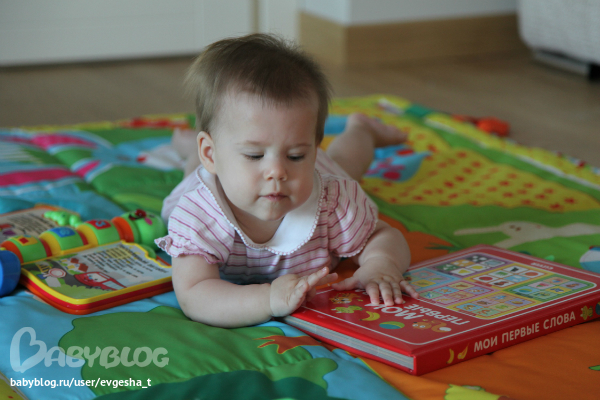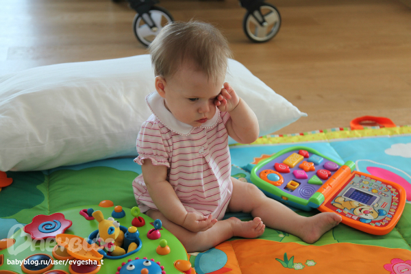 Любит играть с книжками и переворачивать страницы, трогать разные фактуры, доставать украшения из шкатулки, крема из сумочек и игрушки из ящиков. В любимых игрушках по-прежнему пульт, провода и сотовый телефон. Просто обожает смотреть на других детей – смеется, стрит глазки во всю им!))