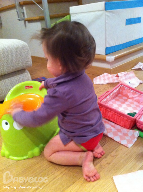 Научилась открывать детские замки на ящиках, придётся покупать механизм защиты посложнее. Если положить перед Соней одинаковые разноцветные бусины – дает того цвета, что попросишь.