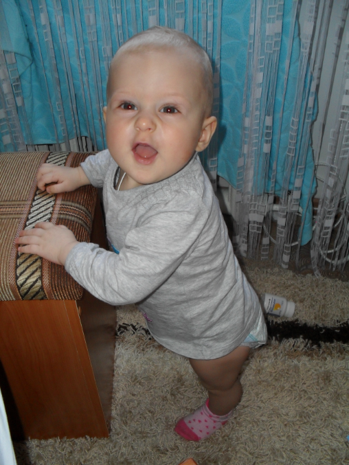 Стоит уже очень хорошо, шагает вдоль опоры. Водим подмышки, ходить ей нравится.