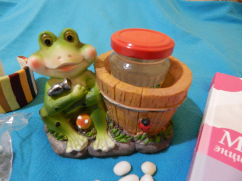 Фото 2. Очаровательная лягушечка. Мой первый фикусик уже поселился в этом бочоночке. В баночке святая вода.
