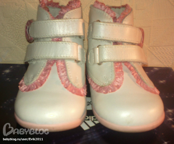 Новые. Котофей. Кожа. 21 размер. Великолепные перламутровые белые с рюшей из атласной розовой ленты. Проскочили, так как было очень много обуви. 600р