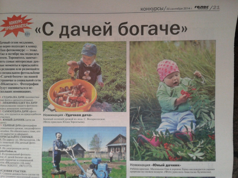 спасибо) иногда участвуем, если у меня тематические фото обнаруживаются свежие. Фото можно по почте электронной, а сейчас у "Голоса" группа в ВК, там фотоальбом создан отдельный конкурсный. Это все тот же конкурс, сначала просто Данину фотку я отправляла, а теперь Лёлину. Думала, уже итоги подведут, а нет, напечатали вот нас еще. Пока конкурс не закончен, можете тоже отправить. Обещают итоги в октябре.