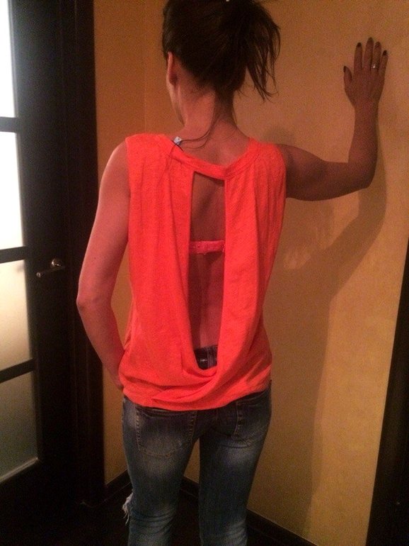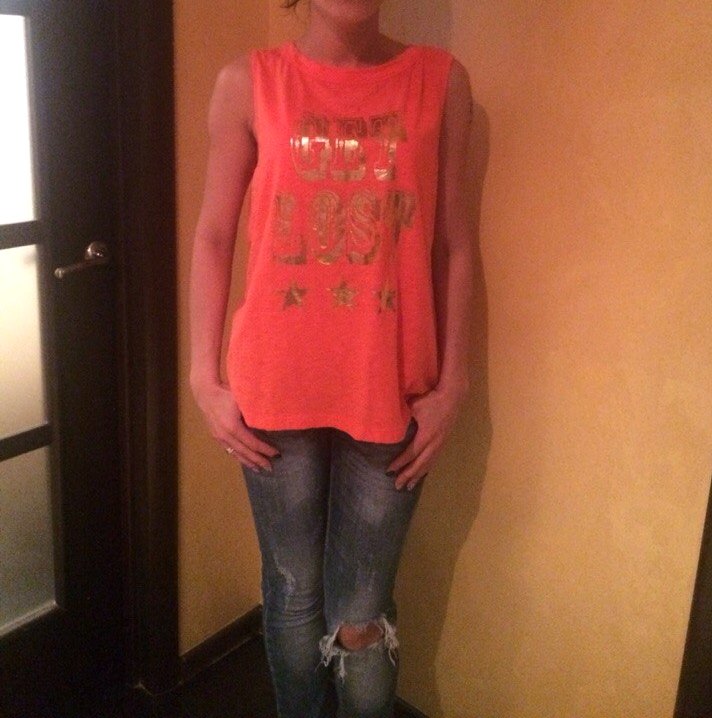 майка яркого коралового цвета !! У меня размер S . По модельке идет и на M и на L ( Проверяли ))) цена 800 р