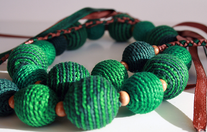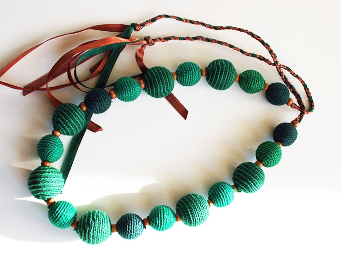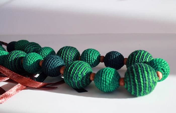 Материал: 19 обвязанных хлопком можжевеловых бусин, 21 маленьких бусин для разграничения, атласные ленты.