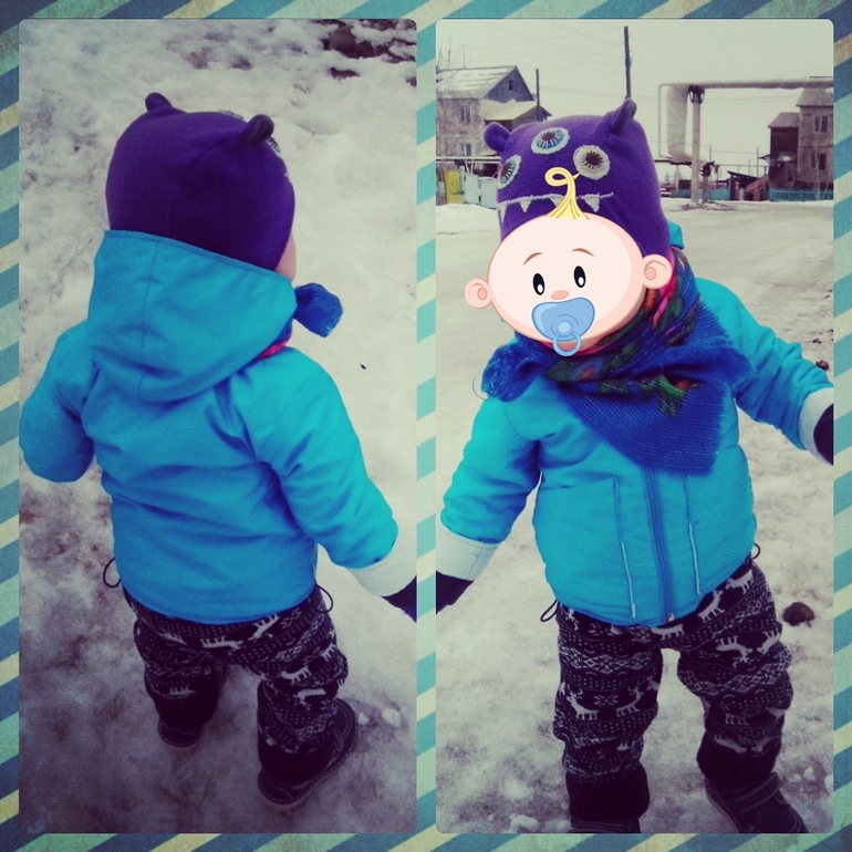 В общем в скором порядке дошила Я свою ветровку. Сходили в ней до магазина, дорога занимает минут 15. Под ветровку одела флисовую кофту на футболку с длинным рукавом и маечку; на ножки хб колготы и какие то теплые штанишки с крупным ворсом по изнанке, носочки двое теплых и наши тонкие ботиночки. 😊 Максимушка не замерз - ножки, ручки, спина и шея горячие, в следующий раз одену либо кофту тоньше, либо уберу футболку или майку.