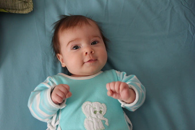 У нас появилась первая родинка на спине, если в папу пойдет то будет в сплошную крапинку. Цвет глаз сейчас зелено-карий.