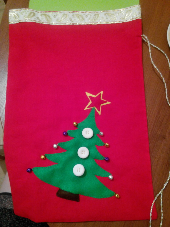 Василиса сегодня была на первой в жизни елке с Дед Морозом. Весь праздник проходил в форме наших обычных развивающих занятий, но с новогодним уклоном. Малыши украшали ёлку, звали Деда Мороза. К Деду Морозу Василёк отнеслась с опаской) подарок из его рук не взяла, а один мальчик из группы как его увидел горько заплакал, остальные дети посмелее были. Потом было наше традиционное чаепитие, я принесла печенье барашки (рецепт взяла здесь на ББ). Ещё фото нашего подарочного мешка, ёлки пришивала сама) долго...)