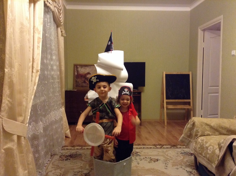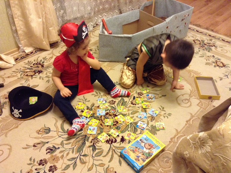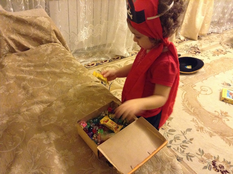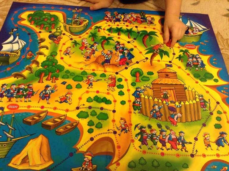 Еще мы играли в настольные пиратские игры. Победитель первым выбирал себе сладкое сокровище с пиратской коробки.