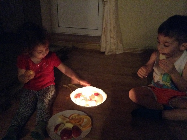 Кормушку сделали самую простую из пластиковой бутылки, но даже такая вызвала столько радости у детей, Мага сам ее наполнил крупой. Повесили у нас во дворе, теперь как выходим из дома дети бегут смотреть сколько птички поели