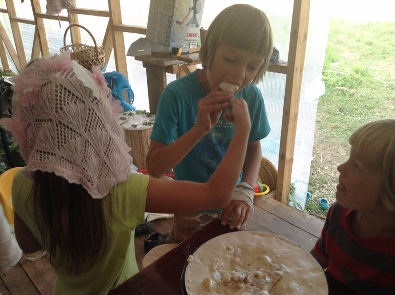 Этим летом, как раз под конец сезона сбора иван-чая организовали очень задорную игру для детей: мы договорились с ними, что сделаем для них торт, если они отгадают слово «Дружба». Отгадать это слово можно было собрав по буквам, которые можно было получить от каждого взрослого, выполнив задание.