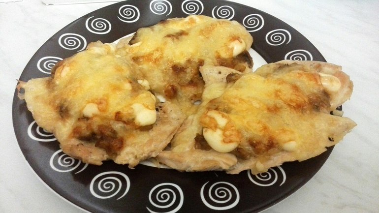 Пока жарятся лук и грибы, каждое филе разрезать вдоль в виде бабочки, отбить. Выложить на смазанную маслом сковороду. Посолить поперчить.