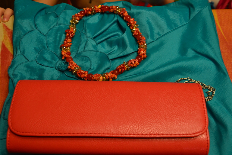 платье, сумка, бусы и браслет, туфли будут светлые(кремовые на высоком каблуке)
