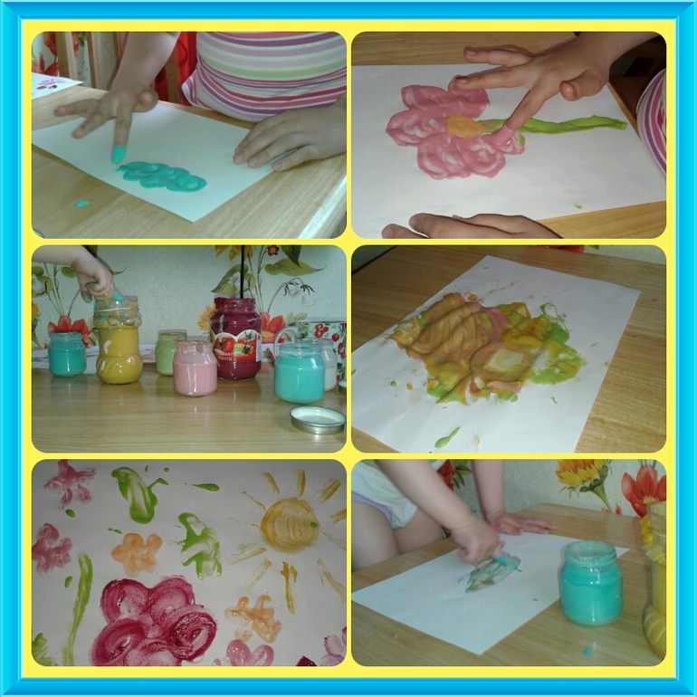 Рецепт пальчиковых красок: на 500 гр. муки стакан соли, полстакана воды, перемешать блендером.