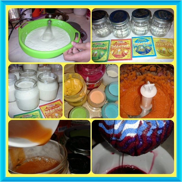Цвета красок получаются при смешивании массы с красителем для пасхальных яиц. И 2 цвета я сделала путем получения сока свеклы и морковь+желток.