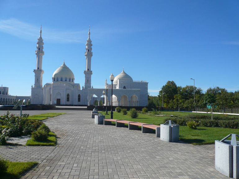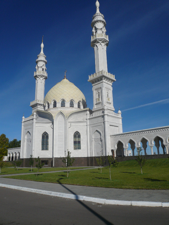 И еще одна достопримечательность Булгар - Белая мечеть. Шикарное архитектурное "сооружение", Мраморные стены здания украшены резными узорами, окна с витражами, ощущение, что ты находишься в восточной сказке)) перед мечетью Молельная площадь, с фонтанами и цветниками