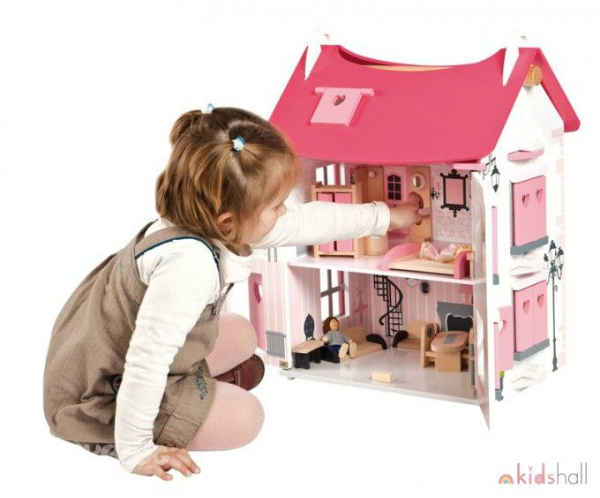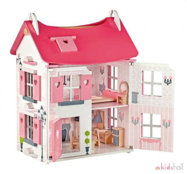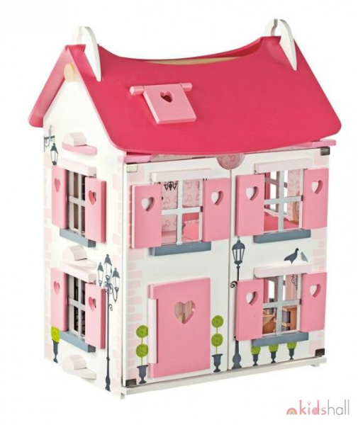 Кукольный домик "Мадмуазель" + 15 элементов мебели + 2 куклы. Домик "Мадмуазель" для маленьких куколок, которые вместе с мебелью для домика уже входят в комплект. Французская компания Janod прекрасно подобрала сочетание цветов, именно поэтому домик выглядит очень нежным, милым и изысканным, как снаружи так и внутри. Домик получился большой и светлый, так как окна расположены на передних панелях и по бокам. Окошки украшены розовыми ставнями, которые открываются и закрываются. Примечательно мансардное окно на крыше домика - сразу заставляет обратить внимание на этаж под крышей. Крыша у домика с полукруглыми краями, что придает домику лаконичный стиль. А удобная деревянная ручка между панелями крыши домика позволяет удобным захватом руки переносить этот домик с места на места. Очень интересная и необычная роспись (только у этого производителя) внешних стен домика создает ощущение городского пейзажа вокруг. Домик открывается спереди - очень удобные выемки наверху дверец передних панелей. Внутри два просторных этажа и мансардный этаж под крышей. В комплекте с домиком вся необходимая мебель для кукол: гостиная, кухня, ванная, спальня. Мебель сделана из дерева. Окрашены цветом только основные детали мебели - поэтому внутри домик выглядит очень естественно и натурально. Когда смотришь на открытый домик сразу заметно безупречное сочетание между внешним цветом, внутренней отделкой домика и мебели. Домик с мебелью и обязательно 2 маленьких жильца также в комплекте с улыбающимися и радостными лицами.