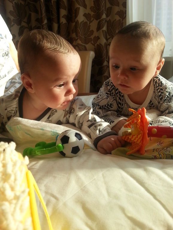 16.06.2014 путем ЭКС в 36 недель в 12.52 и 12.53 Митя 3280 50 см, Вова 3260 51 см., в это день был бум родов, поэтому в интенсивной терапии я пролежала более суток, когда подняли в палату оказалось что Митю положили под капельницу, я в шоке Вову мне дали на некоторое время потом забрали, на сл.день и Вову положили под капельницу, толком ничего не сказали, "инфекционюшка". На третий день сказали что переломный если улучшения не будет, отправим в больницу. И опять на мой вопрос никто ничего не отвечают. Слезы градом. Но слава Богу все обошлось. И на седьмой день я с детьми бежала оттуда.