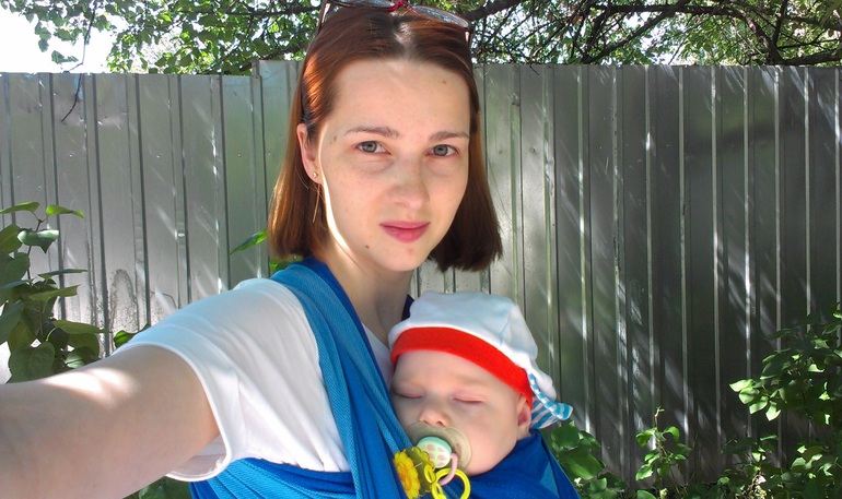 И муж меня поддерживает в вопросе слингоношения, особенно из-за удобства для спины. Коляска у нас уж очень тяжелая(17кг), я сама её выкатить не могу по ступенькам, поэтому раньше гуляли только вечером после работы. А гулять-то хочется, лето ведь, поэтому если мне одной выходить, то только на руках. Малыш у меня некрупный по весу (6 кг в 3,5 мес), но при моих 42 кг спина просто отвалится, если не использовать слинг.