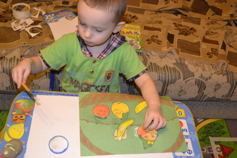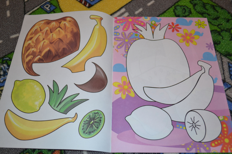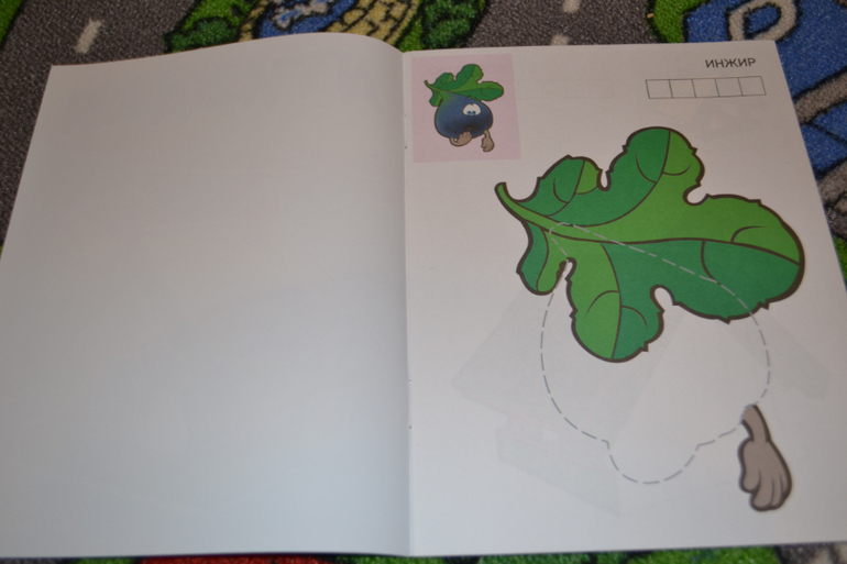 Эта книга как раз из серии Произвольное наклеивание.Т. е. клЕить ребёнок может куда хочет.Фона, честно казать, маловато.Сам фон непривлекательного цвета.Однако для первых разов подойдёт такой вариант.Ксати, один фрукт так и не опознали...