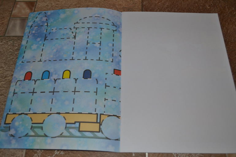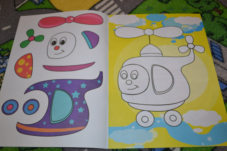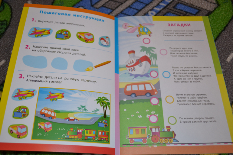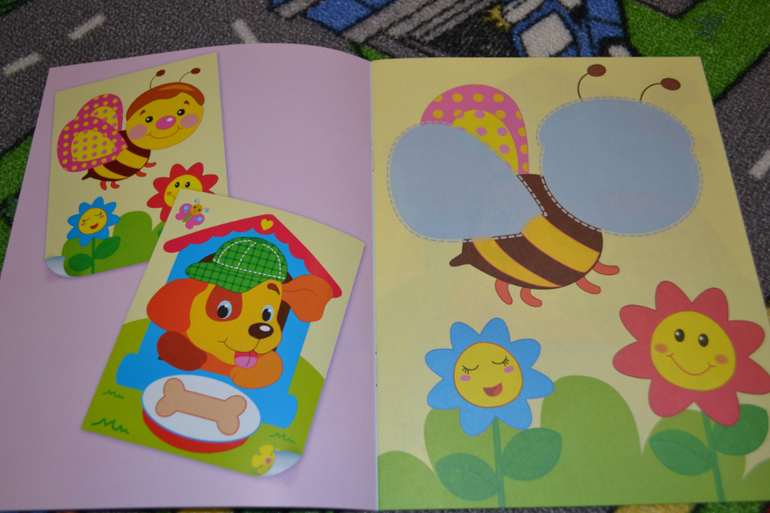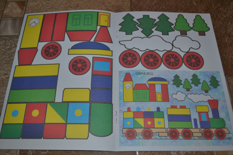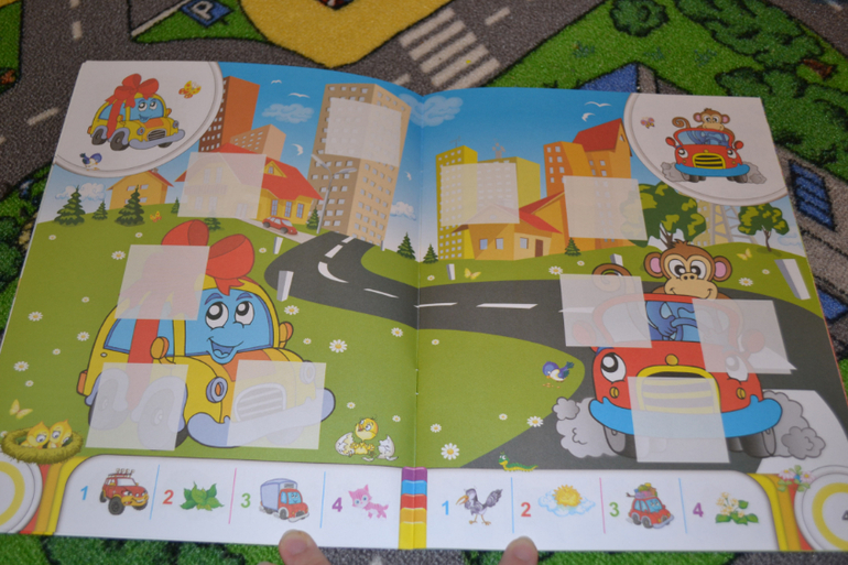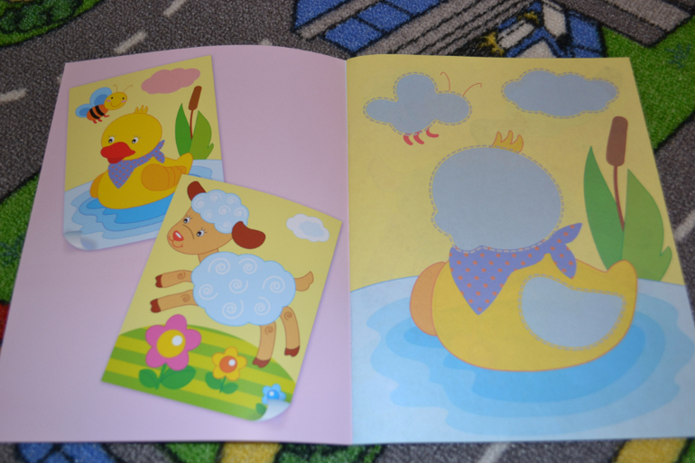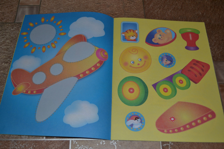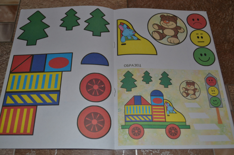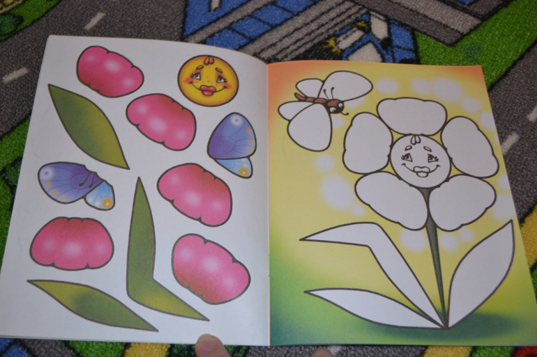 Конкретно в этой книге нужно наклеить детальки паровозика по образцу.Детальки небольшие, их много.Сначала ребёнок загорелся, особенно ему понравилось раскладывать все вырезанные мамой элементы по местам.Однако брались за эта книгу уже несколько раз, но пока так и не доклеили - надоедает ему...