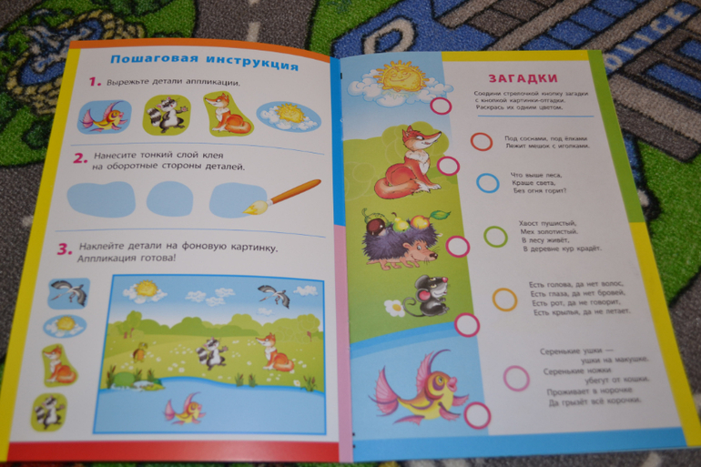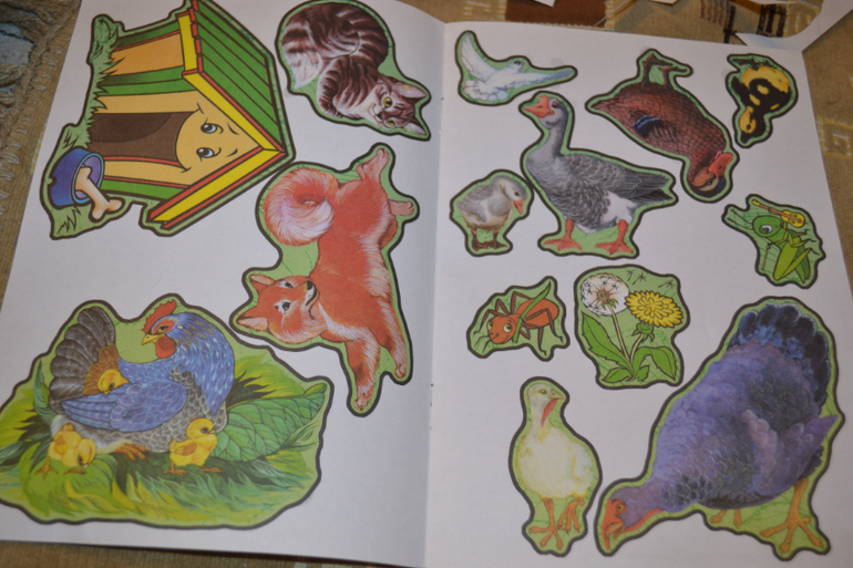 Пособие примерно тетрадного формата.Деталей для вырезания достоаточно.Герои симпатичные.Вырезать легко.Однако фона очень мало для того, чтобы расположить все детали.Получается совсем не так, как на примере, а все животные друг на дружке.И это при том, что вырезала я компактнее, чем предлагается.Отдельно отмечу загадки на обороте, которые очень понравились ребёнку))