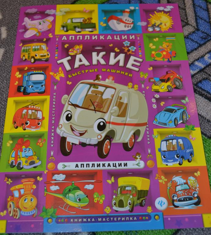 Из всей стопочки новых аппликаций эту Дима выбрал первой.Наклеили за два захода.В книге 4 картинки.Бумага тонковата.Детали как крупные, так и мелкие.Некоторые детали вырезать и в дальнейшем клЕить тяжеловато, особенно для ребёнка (тонкие, длинные, сложной формы).
