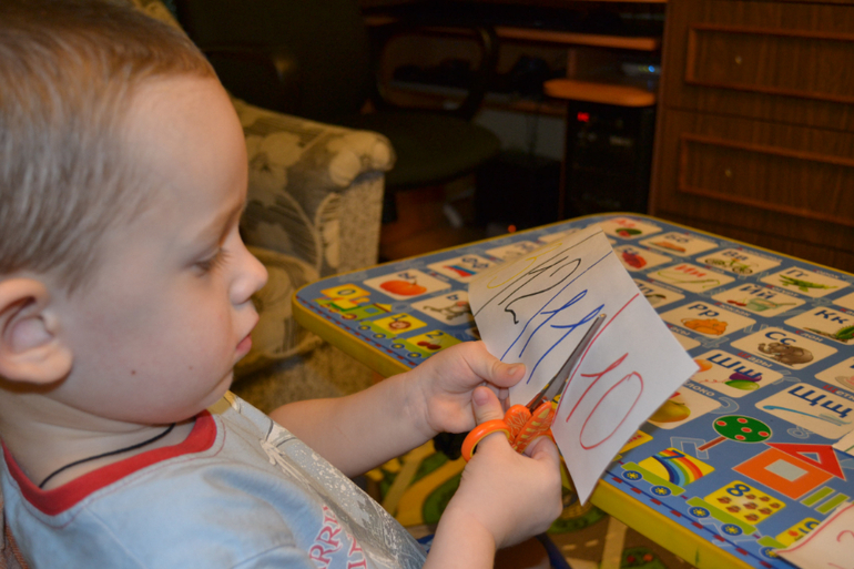 Тренироваться мы стали на использованных листах А3 (мы на таких рисуем красками): на чистой стороне я расчерчивала полосы, а Дима их вырезал.Чтобы ему было веселее, я на этих полосах писала его любимые цифры и расчерчивала их.Дима сначала вырезал по прямой полосы, потом отрезал цифры.Это занятие ему очень понравилось и оно оказалось очень полезным.