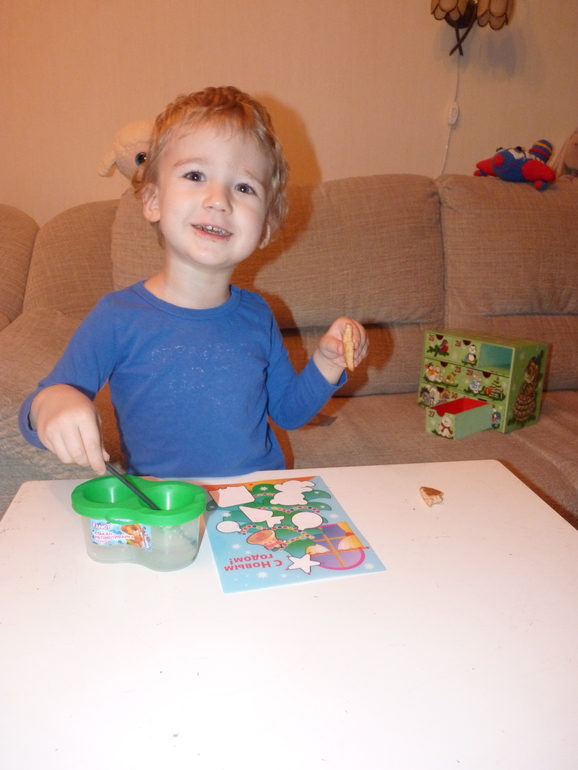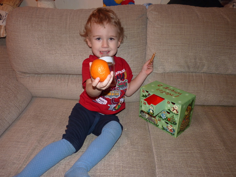 про КирюшкуВчера у Кирюшки был очень насыщенный день, в саду был новогодний утренник, с дедом морозом и подарками, поэтому дома я решила немного схалтурить и в нашем комодике его просто ждал мандаринчик, без поисков, без подарочков, просто достали и съели))