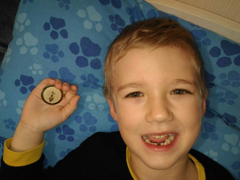 Выпал первый зуб, а за ним и второй)) фея зубная Кирюшке принесла именную монетку)