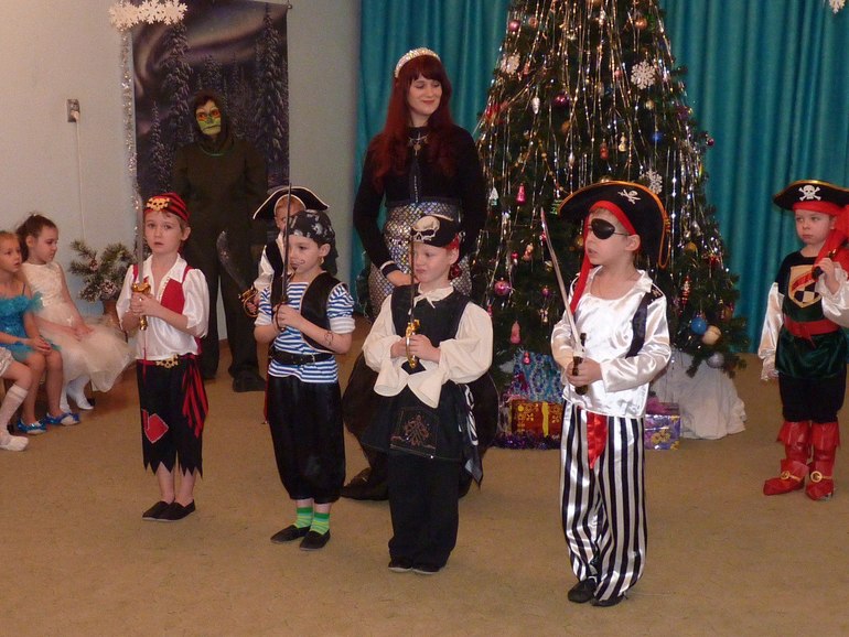 У нас чудесные воспитатели, не перестают радовать нас интересными сценариями и задумками)) На новогоднем утреннике Кирюшка был одним из пиратов, они украли стрелки часов, сражались на саблях, спускались на дно морское к морской царице, пели и танцевали, было очень интересно)