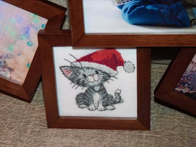 Маме понравился новогодний котенок, попросила его вышить к новому году, я вышила, потом она попросила его оформить) Сошлись на том, что он будет хорошо смотреться в квадратной рамке, ну не вопрос, оформила: