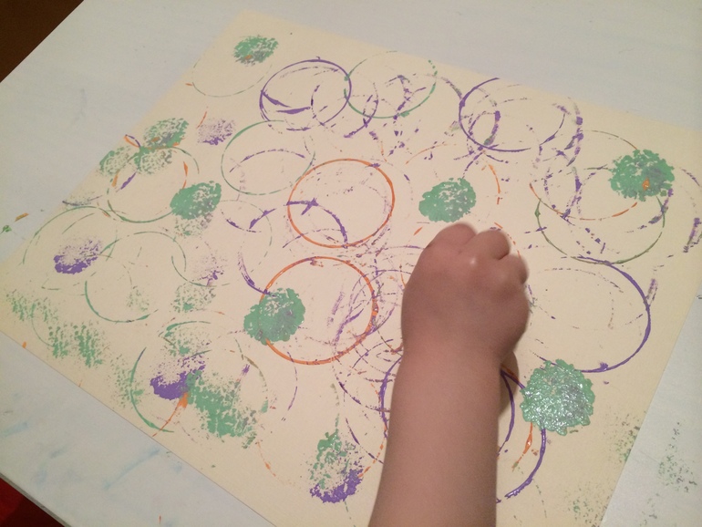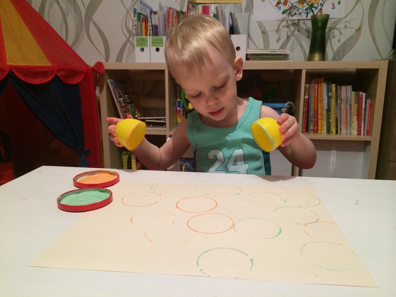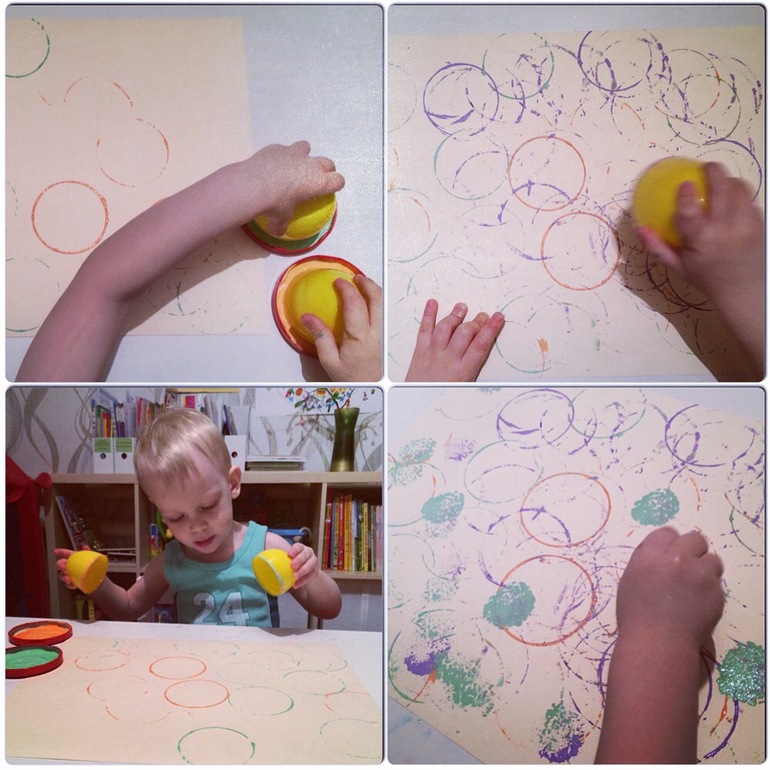 Попробовали рисовать помпоном, не пошло, яйцами веселее))